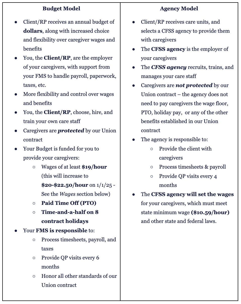 - The agency and budget models of CFSS are different in several important ways, not the least of which is the guaranteed wage and benefit standards that come with the union contract in the budget model. Once you have a chance to learn about both models through conversations with a Consultation Services provider, you will be the one to decide which model is right for you.*