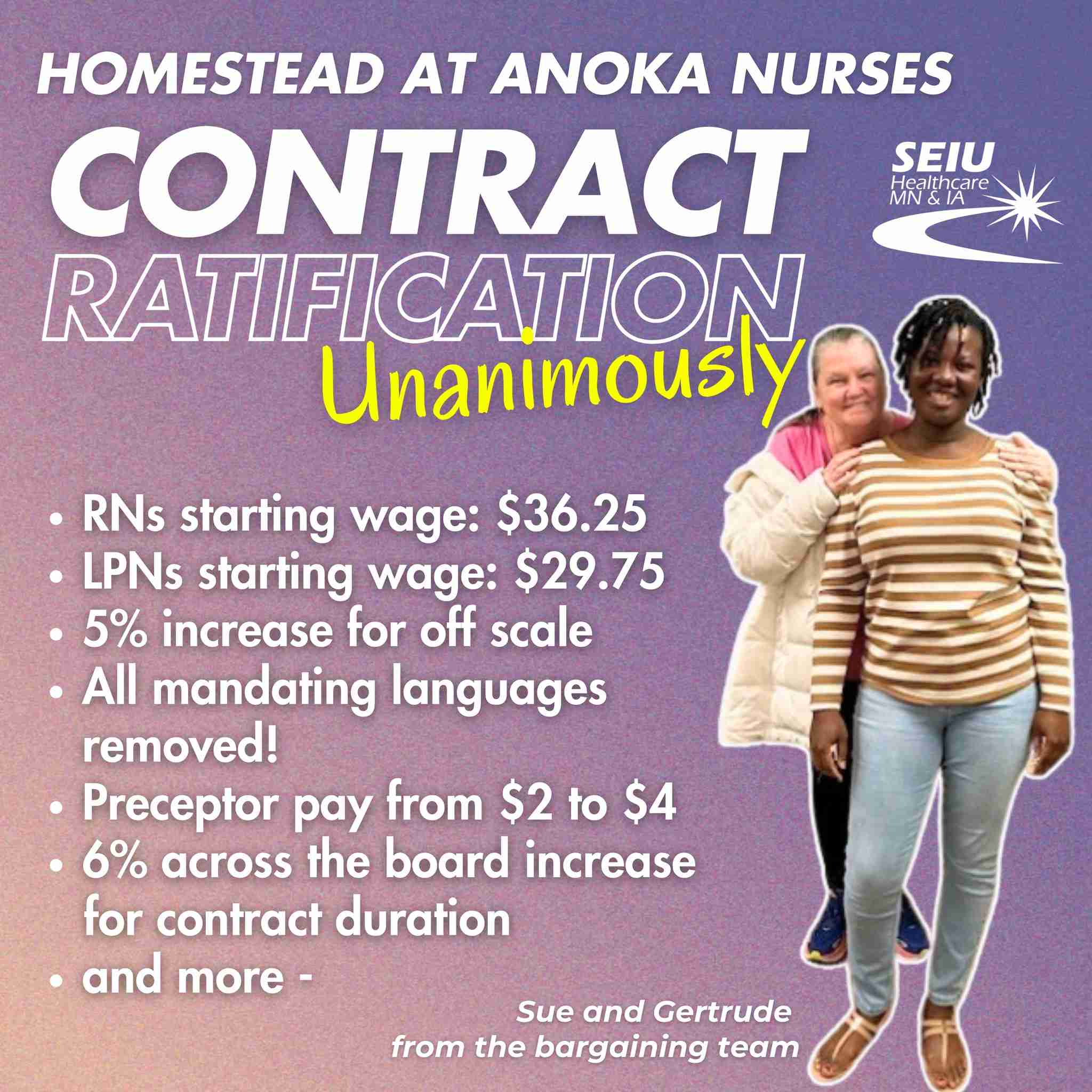 Congratulations to the Anoka Homestead nurses on ratifying a fantastic new three year contract! Members voted for the new agreement unanimously. Improvements include: