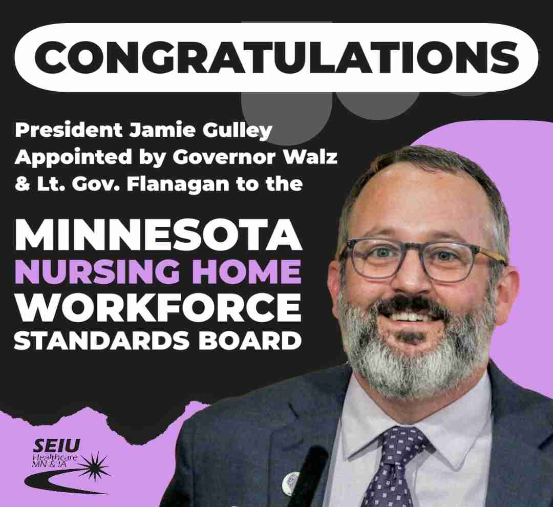 Jamie Gulley, the President of SEIU Healthcare Minnesota & Iowa, shared his excitement over being appointed to the Board and why it’s critical for the group to make strides for nursing home residents and workers: